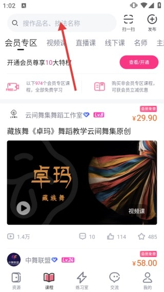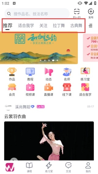 打开软件后,你可以在首页借助【推荐】【适合我学】这类分类标签来筛选舞蹈课程,要是想找特定的舞蹈,直接用搜索栏搜索就行。