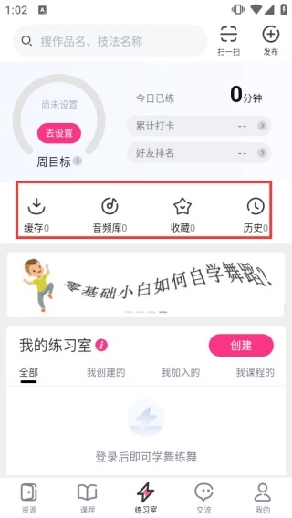 进入【练习室】页面后,你可以利用【缓存】【音频库】【收藏】等功能来辅助舞蹈的学习与练习,登录账号后还能够记录你的学习进度。