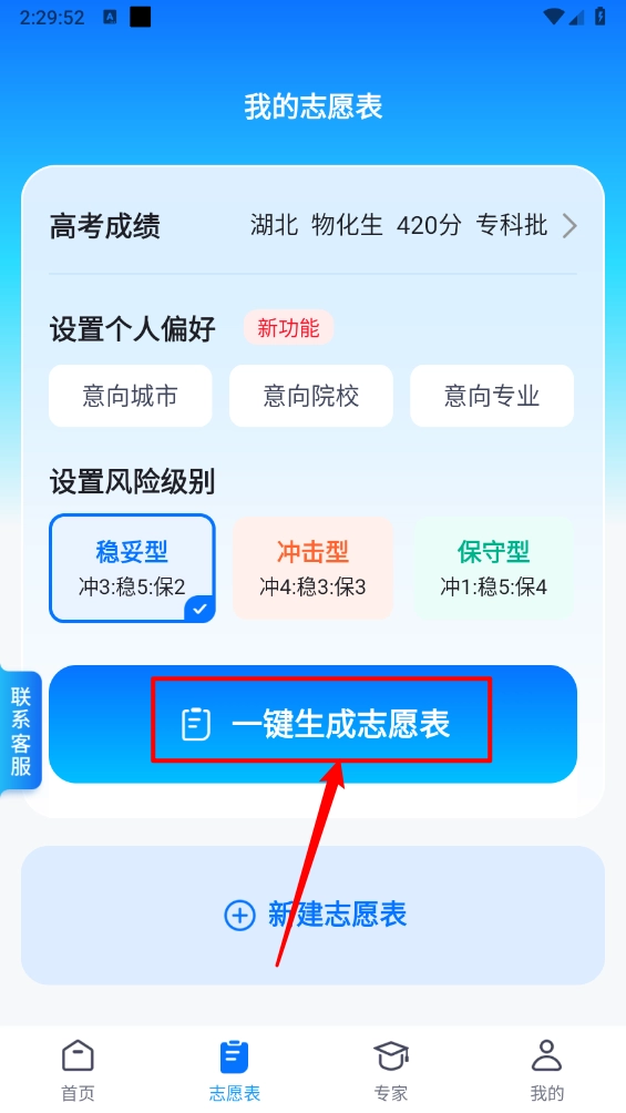 在“志愿表”板块,能够通过设置个人偏好与风险级别来生成志愿表。
