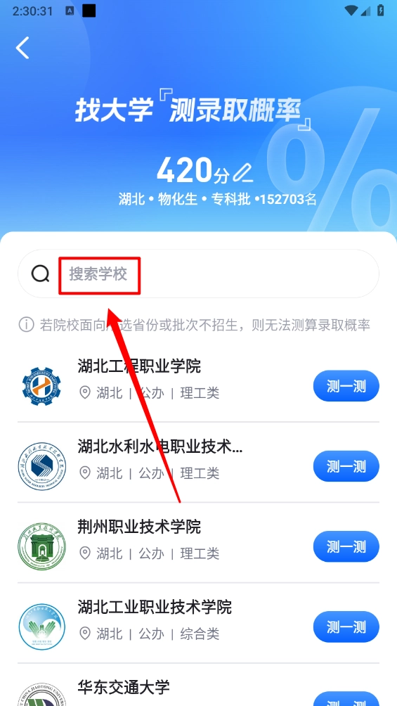 点击“模拟测试录取率”入口,即可搜索相关内容查看录取率。