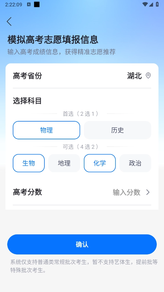 请先选择高考所在省份、考试科目,并输入高考分数,随后点击“确认”按钮进入下一步。