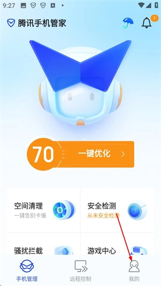 在腾讯手机管家的手机管理界面,点击底部的“我的”选项,即可进入个人中心页面。