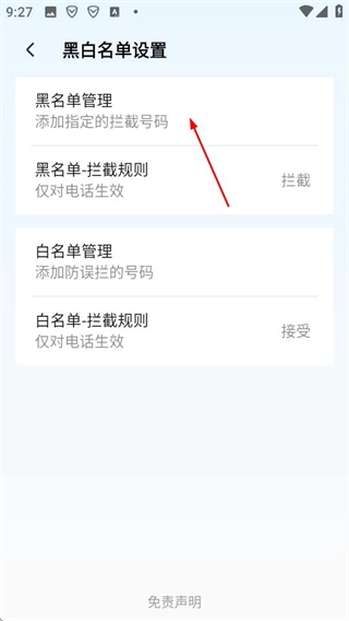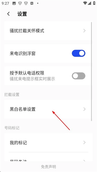 进入骚扰拦截设置界面后,找到并点击黑白名单设置的选项,即可进入对应的黑白名单设置页面。