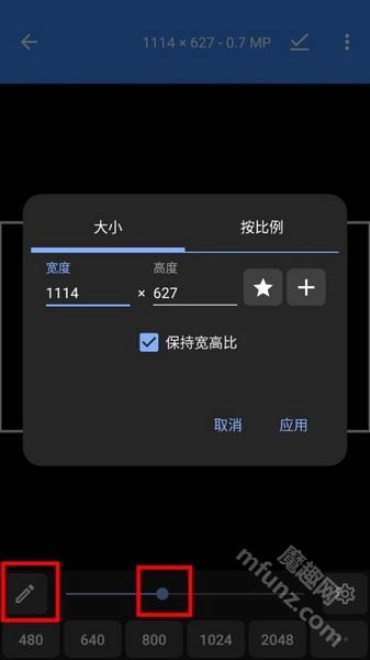 可以拖动滑块调整大小,也能输入比例尺寸,此外还有【480】【1024】【2048】等预设尺寸可供选择