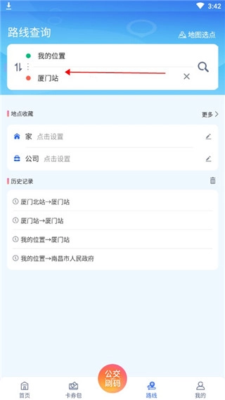 您可以点击首页顶部的【公交路线】按钮,也可以选择点击页面下方的【路线】按钮。