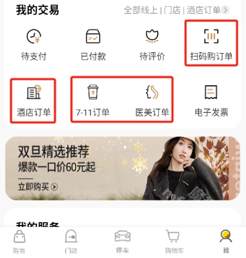 您也可以直接点击进入扫码购订单、酒店订单、7-11订单或医美订单,在订单详情页面直接操作取消即可。