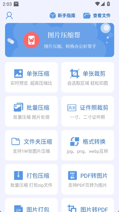 安装并打开图片压缩帮后,首页会呈现出多种功能选项,你可以从中挑选一个自己需要处理的功能来使用。