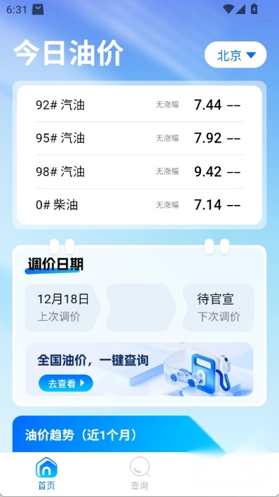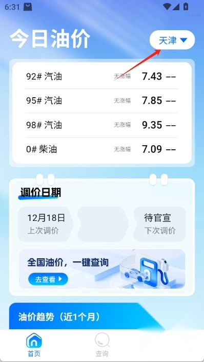 想查看油价的话,可以用油价通这个工具。打开油价通后,在右上角选择你所在的城市,就能看到今日的油价信息了。