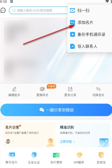 在下拉菜单的选项里,我们要点击【添加名片】这个选项来将其打开。