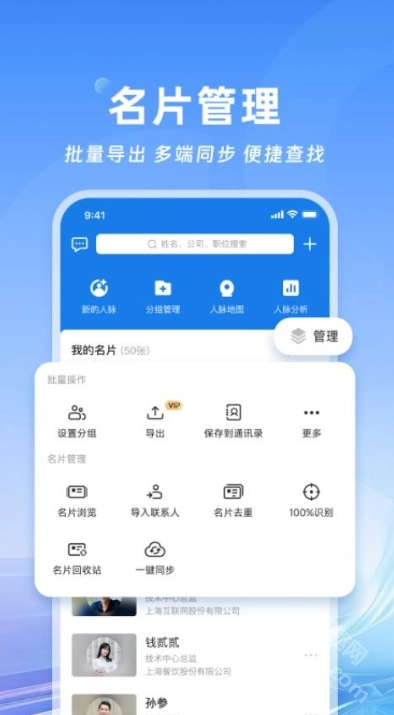 名片全能王具备云端同步功能,即便更换手机,用户的数据也能得到妥善保存,不会丢失。这款软件能够协助用户轻松管理名片,使名片管理工作变得更有条理。它可以识别并存储纸质名片以及微信名片的图片,多张拍摄或连续拍摄的功能让名片录入过程更加高效。此外,用户还能借助该软件在腾讯会议等平台上互相发送数字名片,从而推动商务交流的开展。
