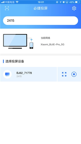 打开“必捷投屏”应用,系统会自动搜索可投屏的设备,只要设备处于同一局域网环境下,就能完成连接操作。