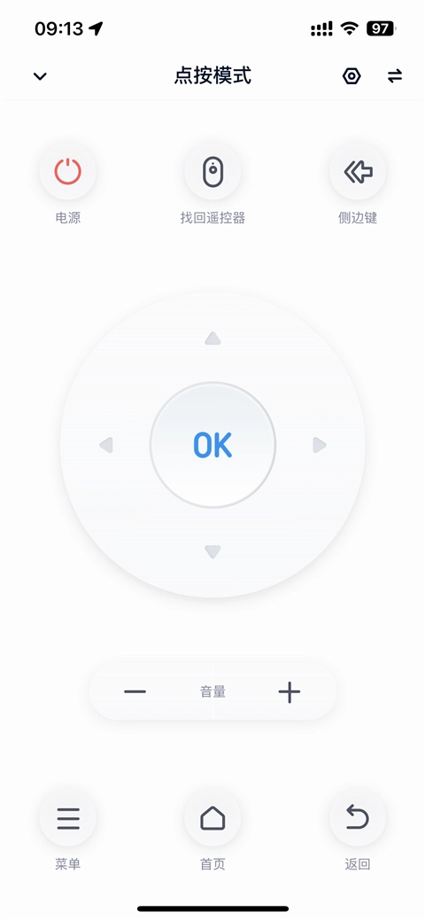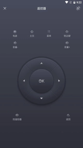 遥控器页面提供菜单、返回、电源、语音等功能。