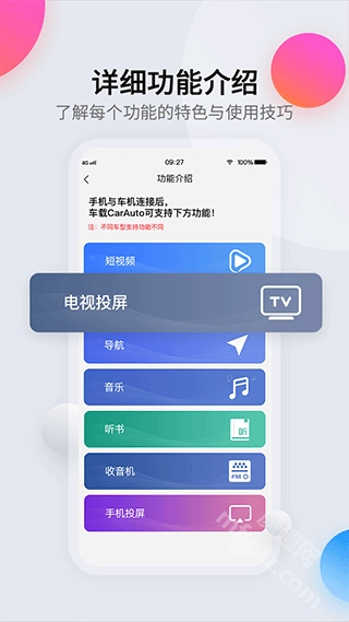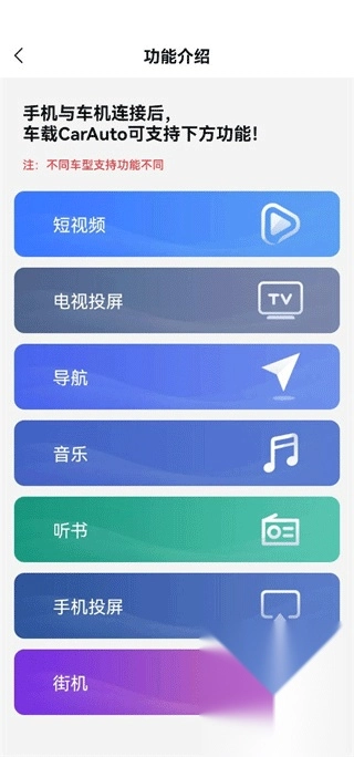 CarAuto除了具备基础的连接功能外,还可实现投屏操作,用户借此能够在车载屏幕上进行视频播放、导航使用、语音助手调用、音乐聆听以及听书等多种操作。