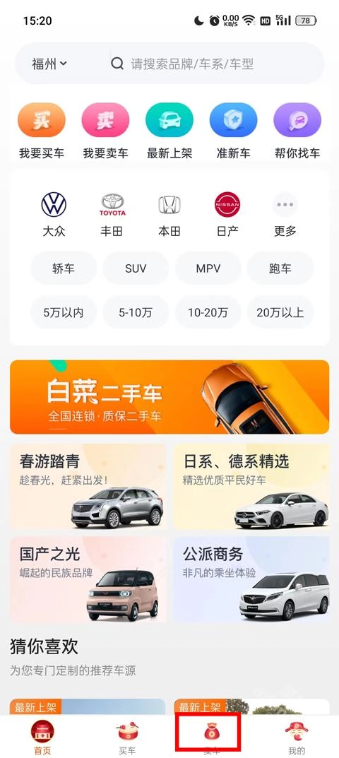 在下方找到【卖车】选项,点击进入卖车页面;