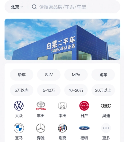 打开白菜二手车应用后,通过手机号完成登录操作,随后进入白菜二手车的首页界面。