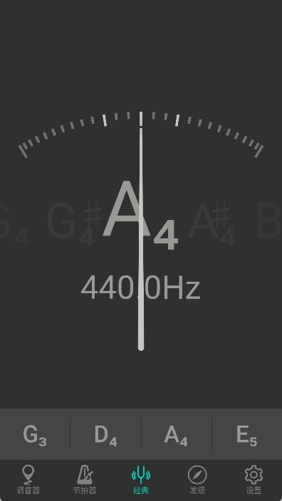 你可以先在设置里把A弦校准到440Hz的标准音高,再以调好的A弦为基准去调整剩下的弦。