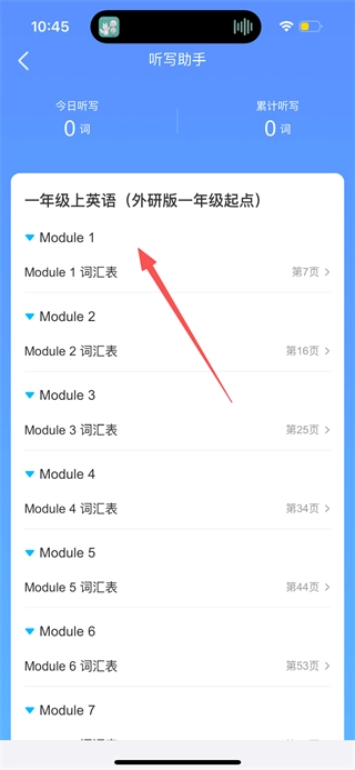 在听写助手页面,点击目标模块,进入该模块词汇表页面。