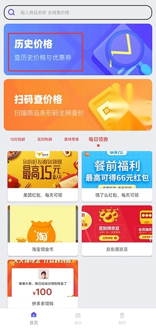搜索商品名称,即可查询各大电商平台的实时价格、可用优惠券以及该商品的历史价格变动情况。