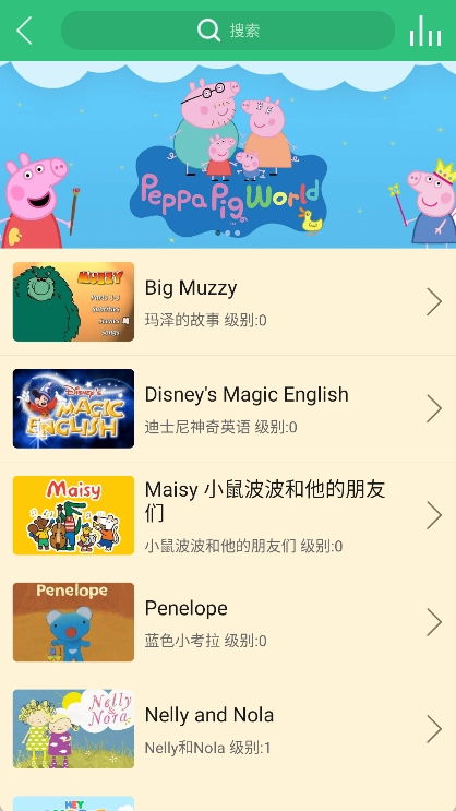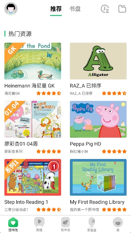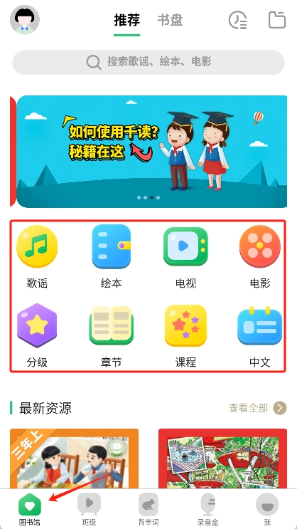 点击“图书馆”页面,挑选歌谣或绘本等入口进入,再依据自身水平选择一个。