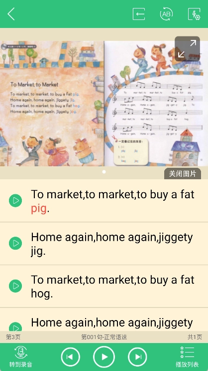成功后点击进入学习页面,借助图片与文本相结合的形式逐句点读,学习英语情境对话。