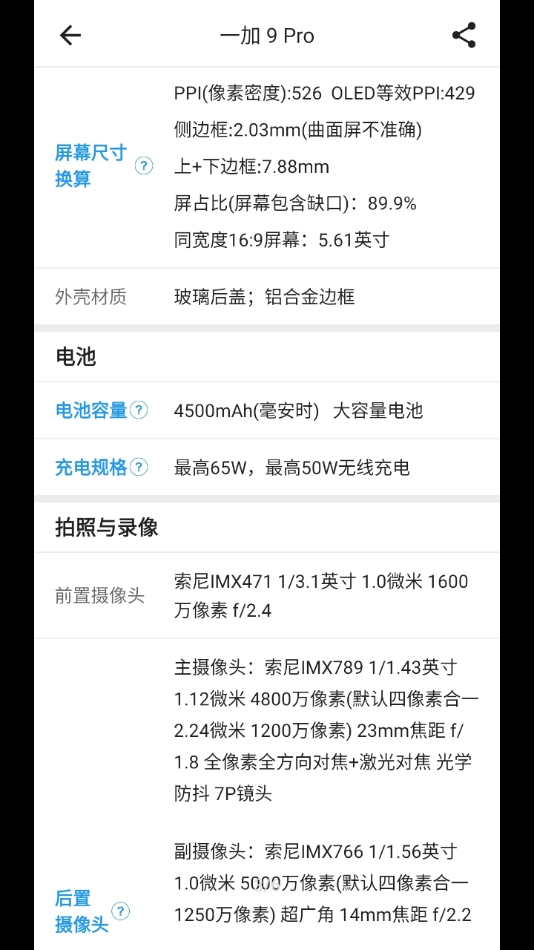 详细参数:包含屏幕尺寸、分辨率、材质、电池容量、充电规格以及相机评测等多方面信息。