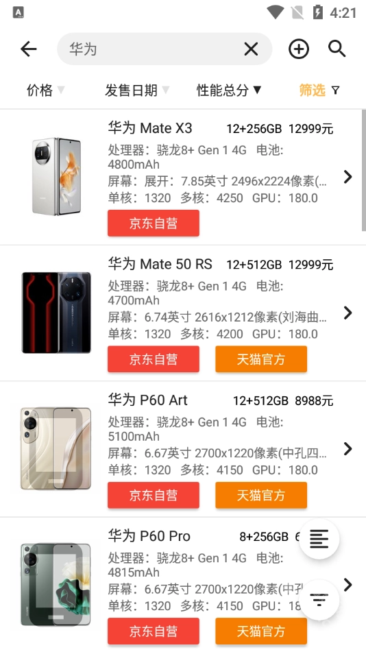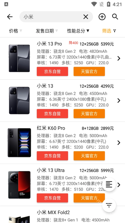3、价格查询:可快速查看京东自营与天猫商城当下的手机售价,便于用户进行比价选购。