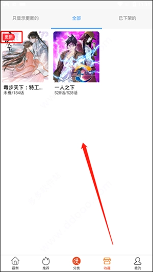 在收藏板块里能够查看所有已收藏的漫画,要是有更新的话,左上角就会出现提醒标识。