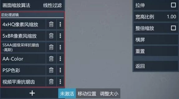 屏幕布局与滤镜方面,新增了4xHQ像素风缩放、5xBR-lv2像素风缩放、SSAA(超级采样抗锯齿-高斯)、PSP色彩、AA-Color以及视频平滑抗锯齿功能。