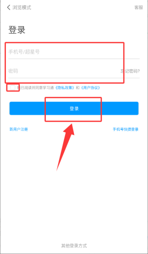 输入手机号或超星号及密码并勾选协议,完成登录。