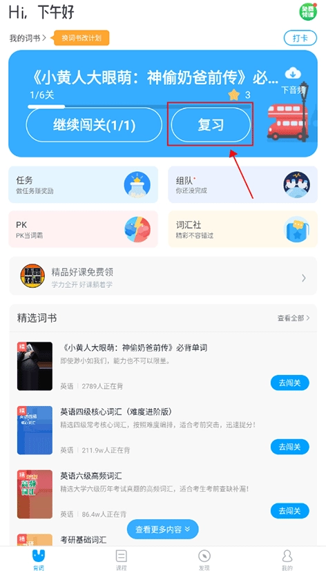 进到沪江开心词场后,点击首页单词书下方的“复习”
