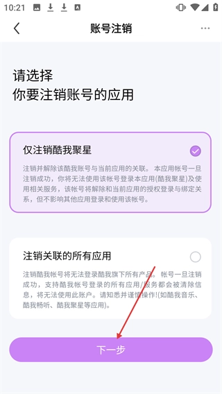 4、选定需注销账号对应的应用范围后,点击“下一步”按钮。