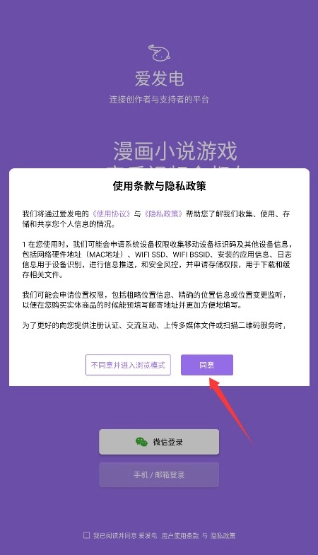 1、首次使用时,请仔细阅读平台的服务条款和隐私政策,确认无误后点击同意按钮,即可进入应用。