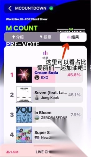 14、点击“结果”按钮就能查看占比情况,快为你喜爱的idol投上一票吧!