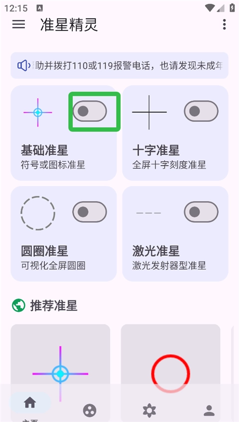 进入软件主页面后,能看到多种准星类型,像基础准星、十字准星、圆圈准星以及激光准星都包含在内,选定其中一个类型后,点击右侧的按钮就能开启该准星。
