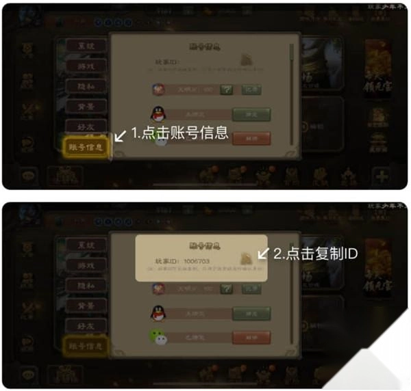 2、找到账号信息页面,复制自己的ID,接着在三国咸话里填写该ID。