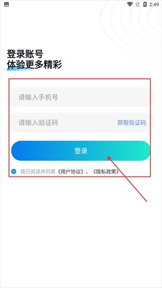 1、首先在【请输入手机号】输入框中填写手机号,点击【获取验证码】按钮,勾选相关协议后,再点击【登录】按钮。