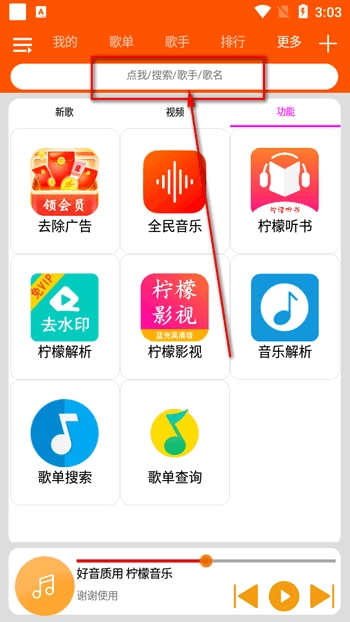 1、打开柠檬音乐,进入首页,点击搜索搜索框。