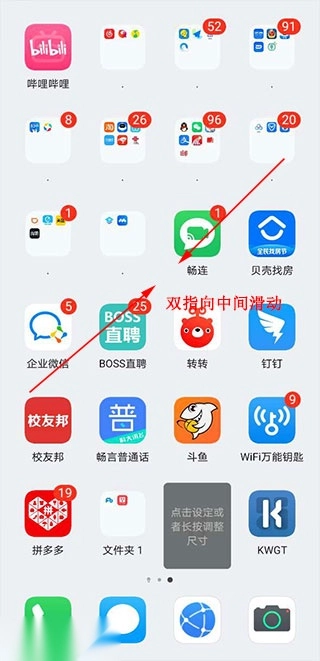 1、这里我以华为手机为例,完成kwgt pro插件的设置后,在手机桌面上用双指向中间滑动。