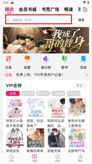 1、打开海棠书城App,进入书城首页后,点击搜索栏即可通过书名进行搜索;