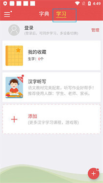 4、回到首页后点击上方的“学习”板块,既能满足日常学习需求,还会新增更多汉字学习相关的课程与游戏等内容。