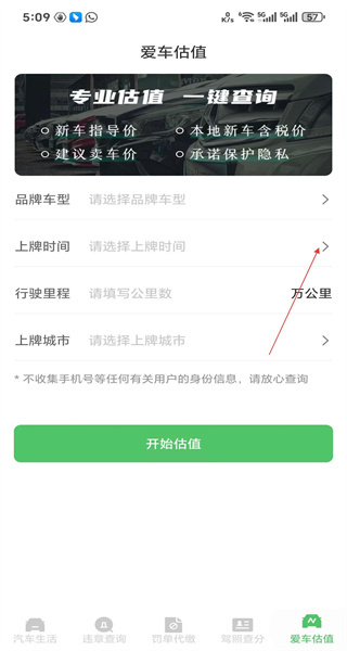 2、进入爱车估值页面后,浏览估值相关选项,找到上牌时间对应的区域,点击该区域即可展开时间选择界面。
