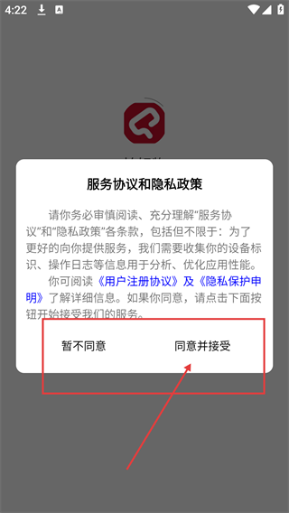 进入应用后会弹出【服务协议和隐私政策】的弹窗,需点击【同意并接受】按钮才能继续使用应用。