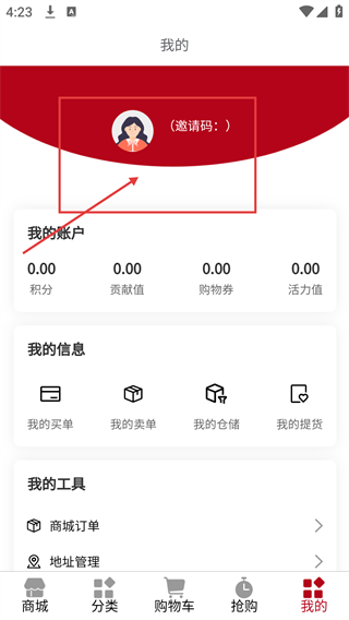 3、进入【我的】页面后,点击顶部的【头像】区域,即可进入个人信息编辑页面,同时还能查看【我的账户】等功能模块。