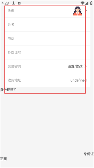 4、进入个人信息页面后,你可以补充完善【头像】【姓名】【电话】这些信息,另外也能进行【交易密码】的设置以及【收货地址】的添加或修改。