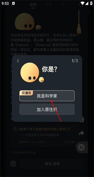 1、启动软件后,进入身份选择界面,点击“我是科学家”选项,开启认证流程。