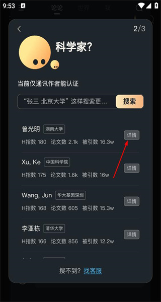 2、进入搜索页面后,查看学者列表,找到曾光明并点击对应的详情按钮,即可进入他的信息页面。
