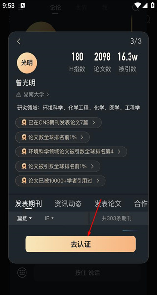 3、进入曾光明的信息页面后,查看他的研究领域与学术成果,随后点击“去认证”按钮,进入身份验证页面。