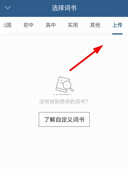 4、这样的话,在选择词书的页面中找到“上传”分类,此时就能看到自己上传的自定义词书,进而添加到不背单词里。
