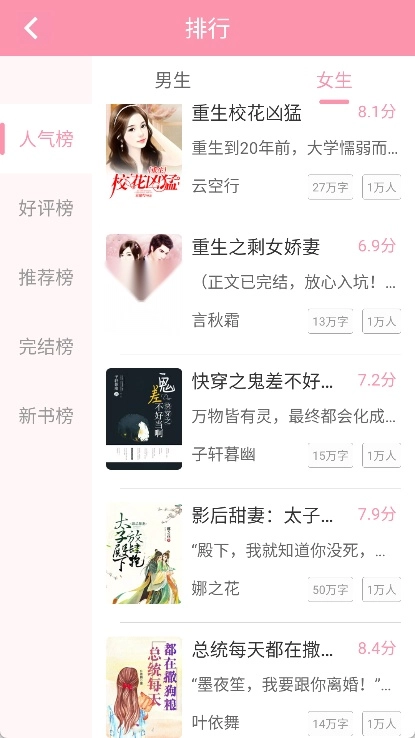 以女性小说为主,涵盖各类言情小说,包括古代、现代、穿越、婚恋、校园、职场、女女王、宫斗等题材。此外还有面向男性的武侠玄幻、修仙、城市、系统、异能、科幻、历史、军事、恐怖等小说。