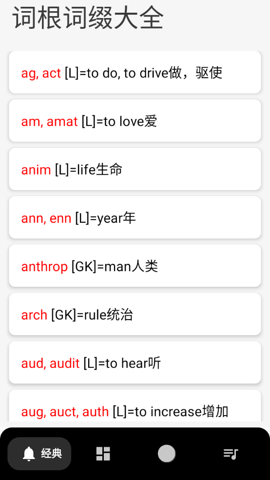 英语词根词缀字典借助拆解单词词根词缀的方法,助力用户轻松记忆单词,支持一键查询功能。它对备考四六级、考研以及专四专八的用户十分友好,还有众多免费学习资料可供使用。要是你仍在为记不住单词而烦恼,这款字典能帮你轻松攻克单词记忆难题。